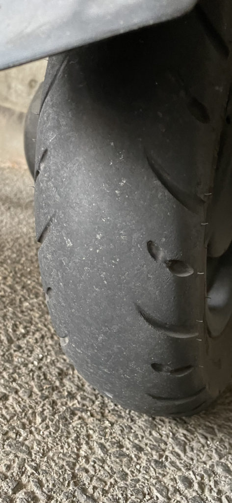 先日普段は見もしない通勤快速のスクーターのリアタイヤをふと見ると